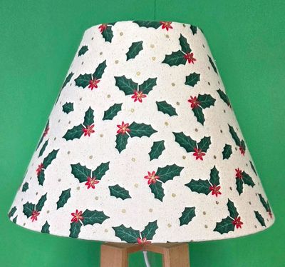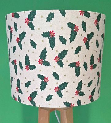 Add a festive touch to your home with this charming Christmas-themed lampshade. Featuring a natural linen-style background adorned with vibrant green holly leaves, bright red berries, and delicate golden dots, this design brings warmth and holiday cheer to any space.